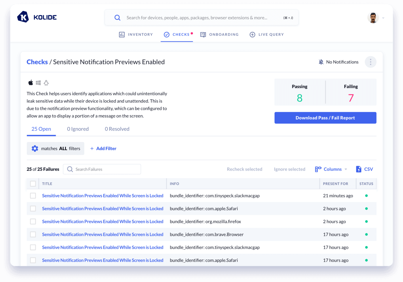 Checks are the power-feature of Kolide, allowing you to notify your end-users directly when there are security issues with their device.
