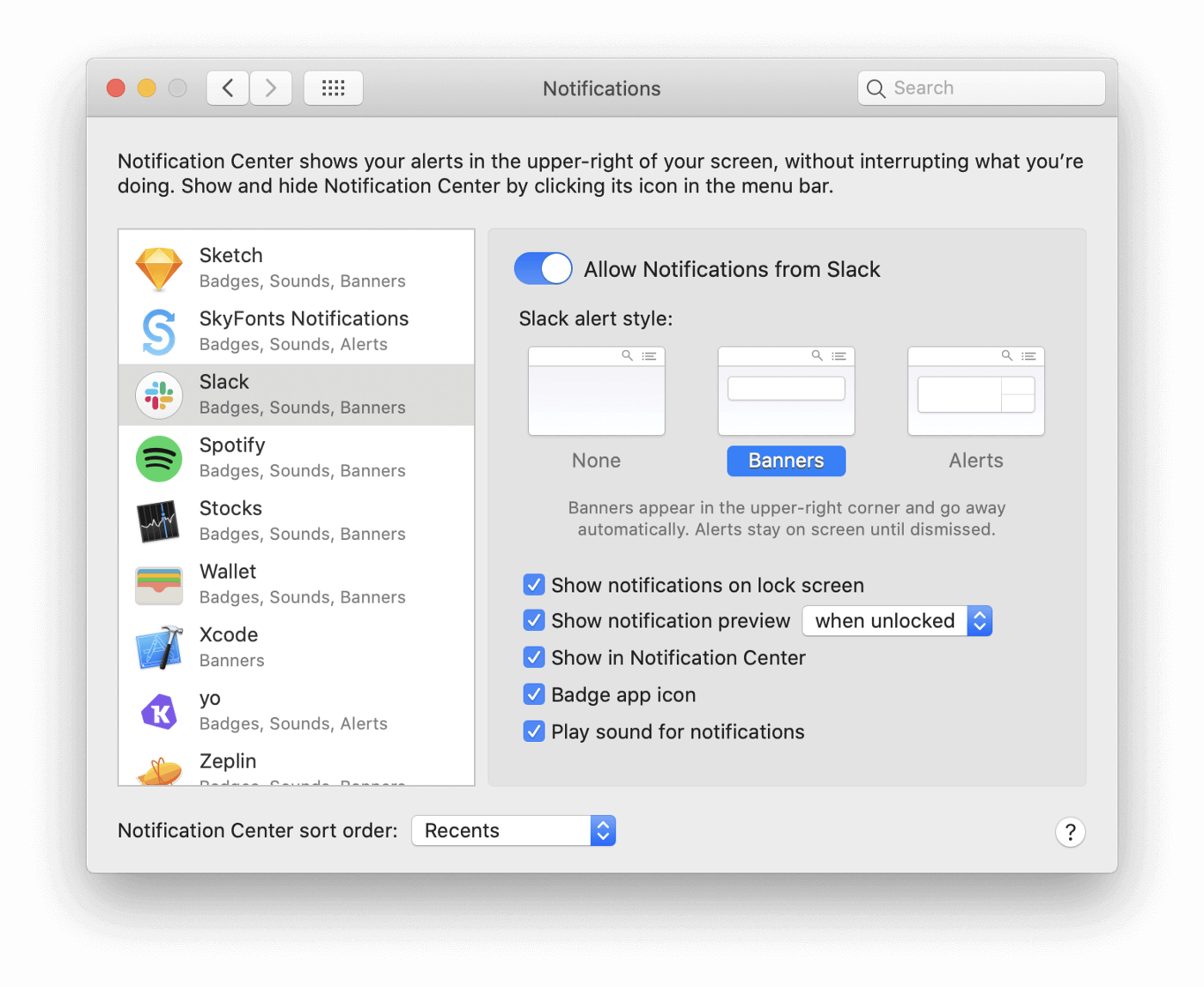 Since macOS 10.9 Mavericks, Apple has allowed per-application configuration of notifications. Using this Preference Pane you can tailor each application’s notification style, allow previews and even mute notifications entirely.