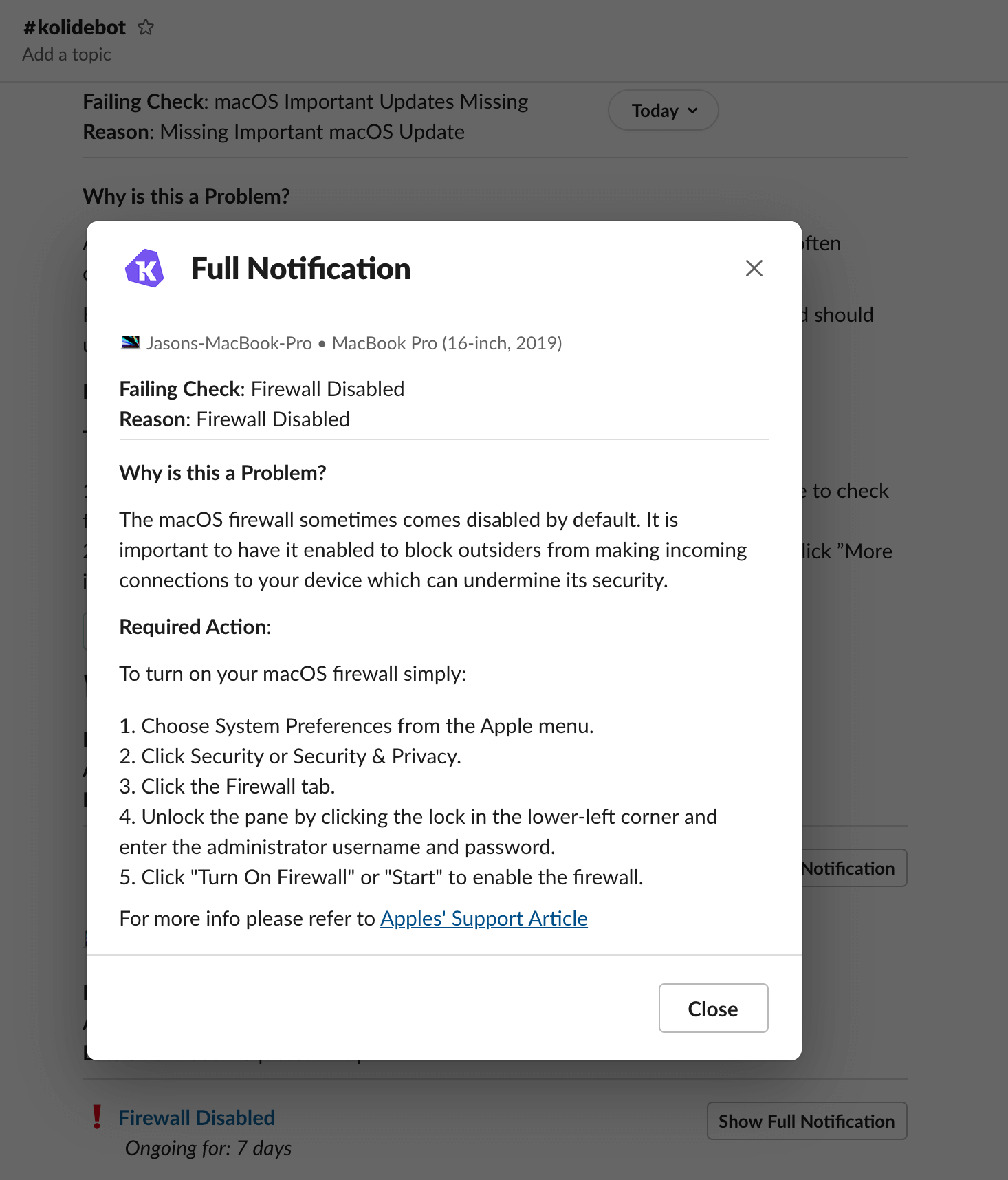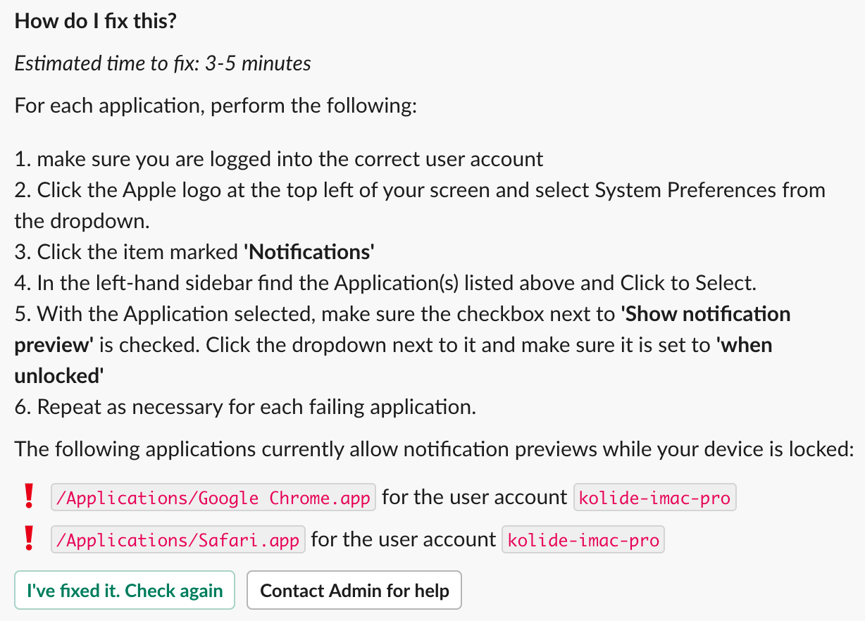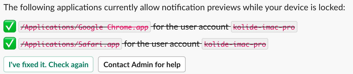 Now, when a user clicks “I’ve fixed it. Check again” Kolide will recheck each failure listed at the end of the message and strikethrough the ones that the user has fixed.