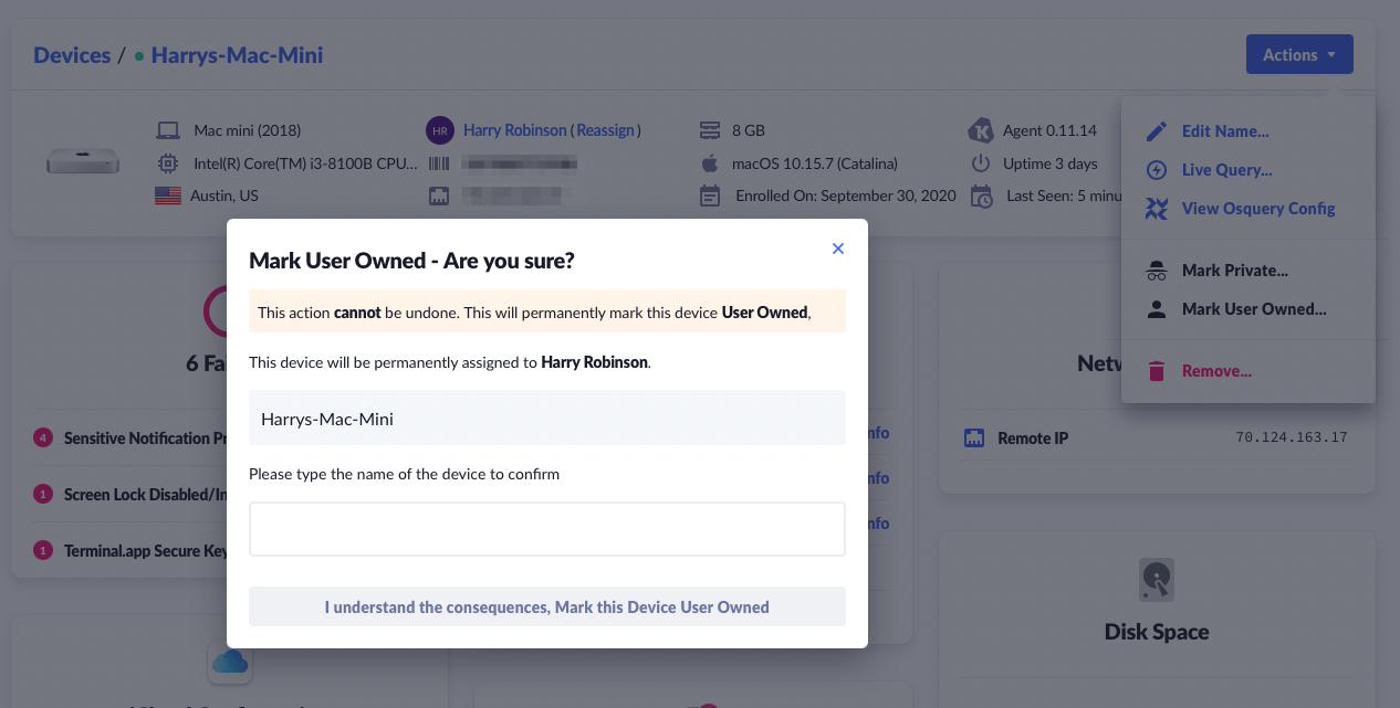 Right now, the only functional change in marking a device User Owned is that Kolide will not allow you to re-assign it to someone else. While that doesn’t sound like a big deal today, Kolide has several planned features with its upcoming MDM that will require informed consent, from an end-user before they can be used. It’s important that end-users understand that this consent process cannot be circumvented by re-assigning the device to someone else, especially for devices that they own.