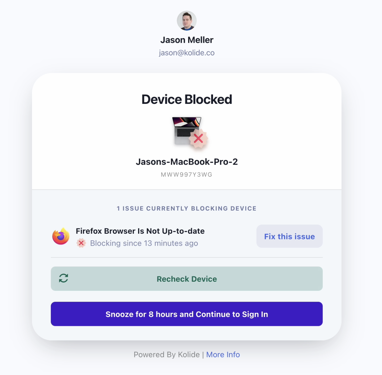 Once a device is failing a check, administrators can notify end-users about the problem, give them a reasonable time to do the update, and if they don’t, block that device from authenticating to sensitive apps.