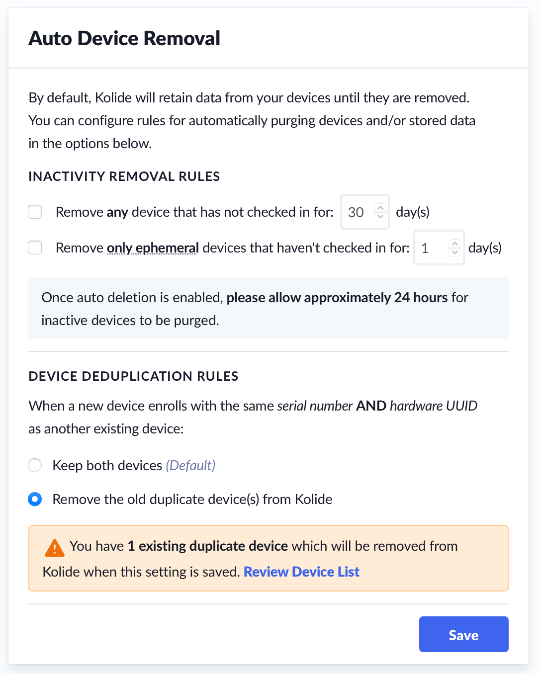 As our customers continue to grow the number of devices they enroll, many of them are looking for more advanced options to manage when inactive devices are removed automatically or if multiple device records exist in Kolide for a device with the same serial number.
