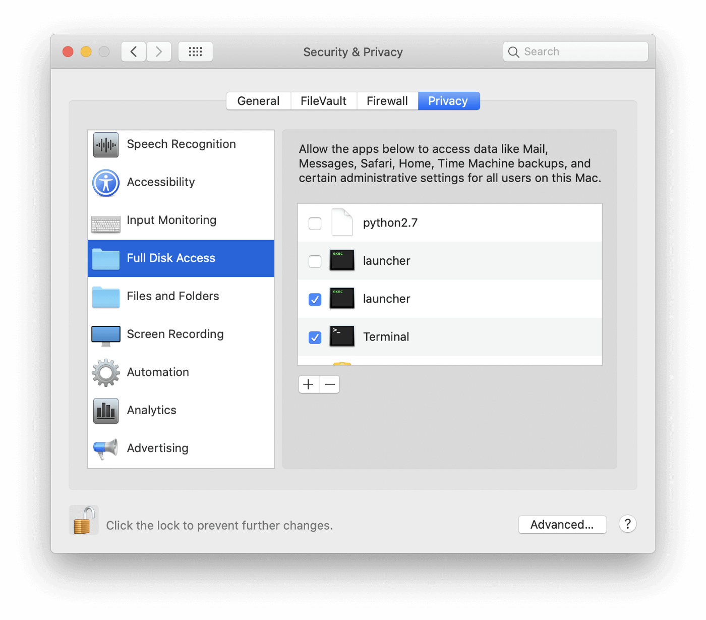 Full Disk Access is the only Privacy scope which will not prompt users to grant permission when an application requests it. This means rather than relying on your application, osquery agent, Kolide launcher to request permission, users have to explicitly grant permission on their own via the GUI. Doing so is relatively easy and is documented for Kolide users in our Support Documentation: