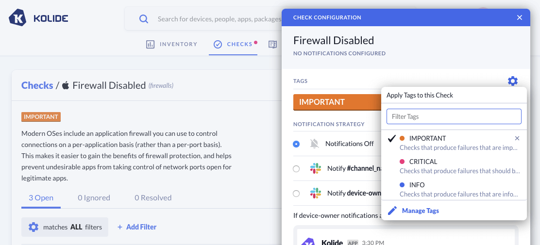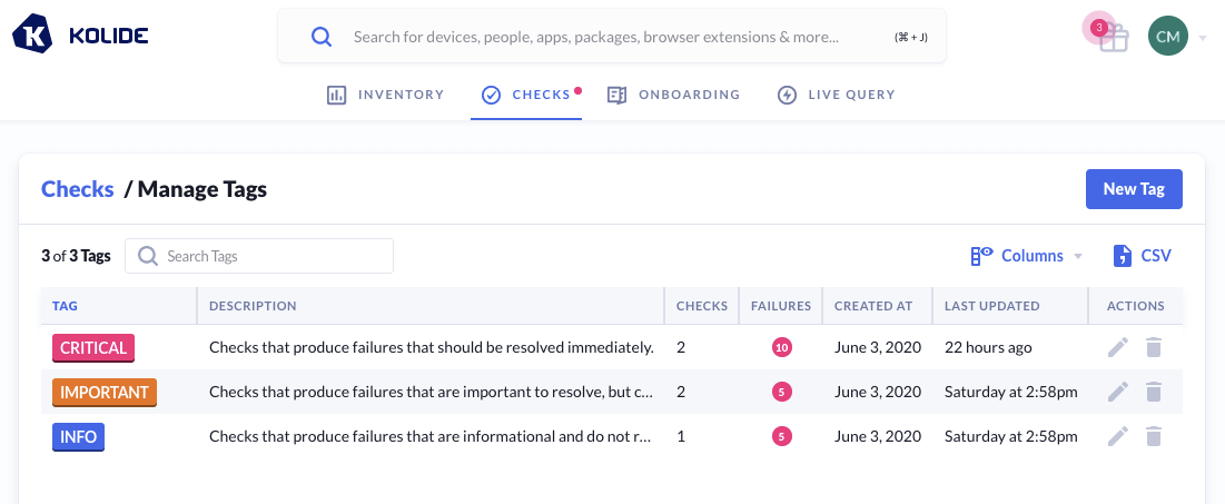 Starting today, you can now apply your own custom tags to the Checks deployed in your Kolide instance.