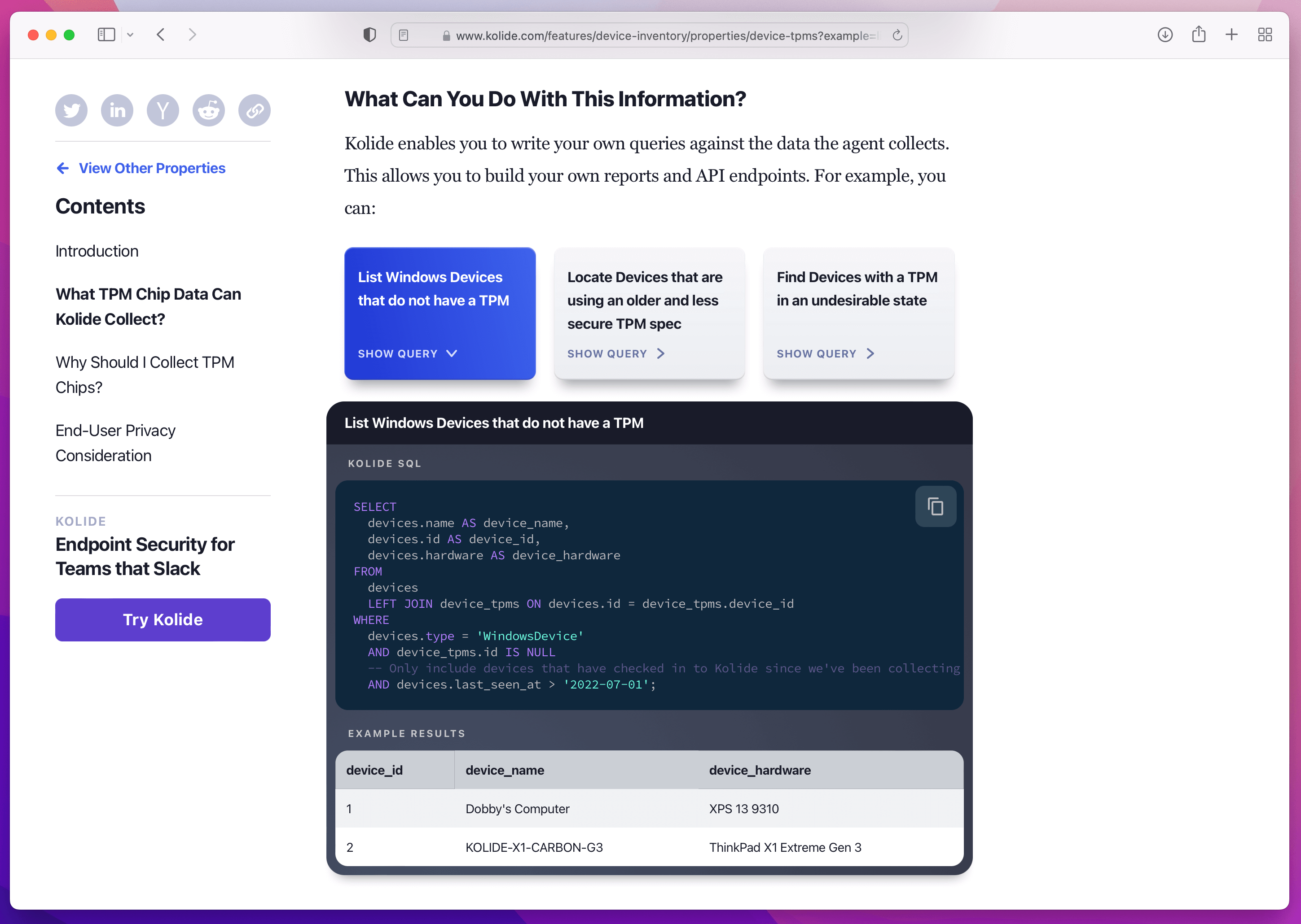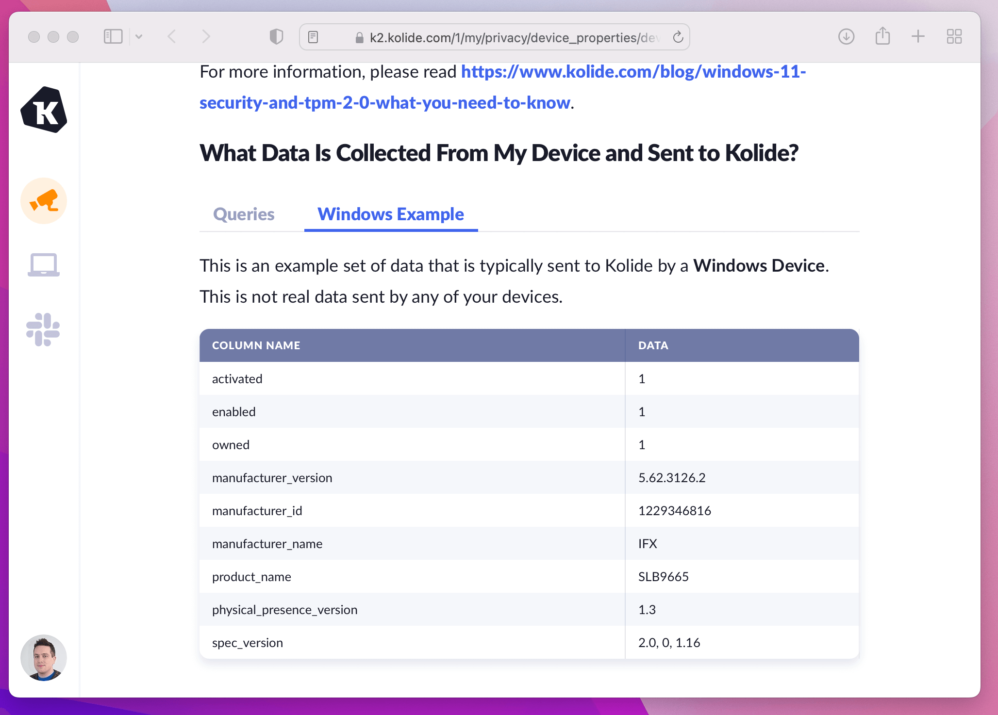 Kolide’s agent takes advantage of osquery’s tpm_info table, which enumerates