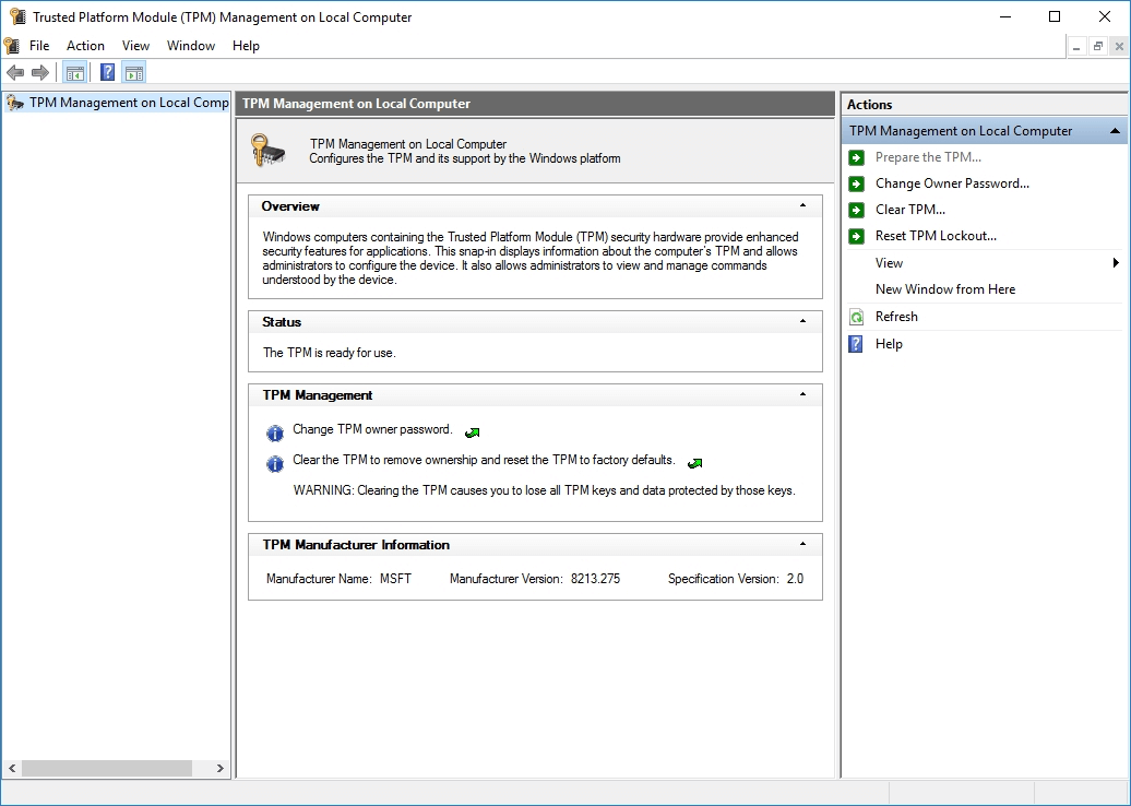 For example, if a TPM is available on Windows, it can be used to encrypt the disk of a Windows PC securely. Other Windows features enabled by a modern TPM include Credential Guard, Device Health Attestations, Windows Hello Passwordless Access, Virtual Smart Cards, and more.