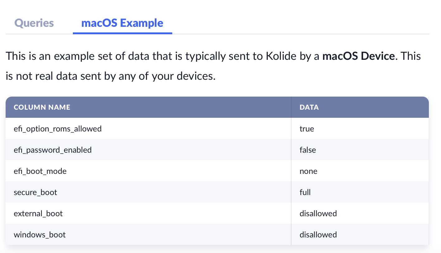 The settings reported in the device property can help administrators better understand the security posture of a Mac. For example, a Mac with Secure Boot off may be at greater risk of being infected by malware that changes the master boot record (MBR). Additionally, the presence of a firmware password could prevent an administrator from re-provisioning a device to a new employee if they forget to turn it off before shipping the Mac back to HQ.