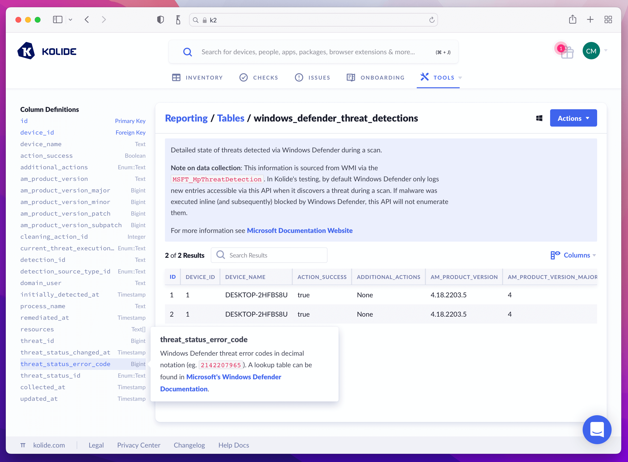 While this is helpful, we wanted to go a step further and provide significant detail around the operating status of Windows Defender and also enumerate any threats discovered during scans.