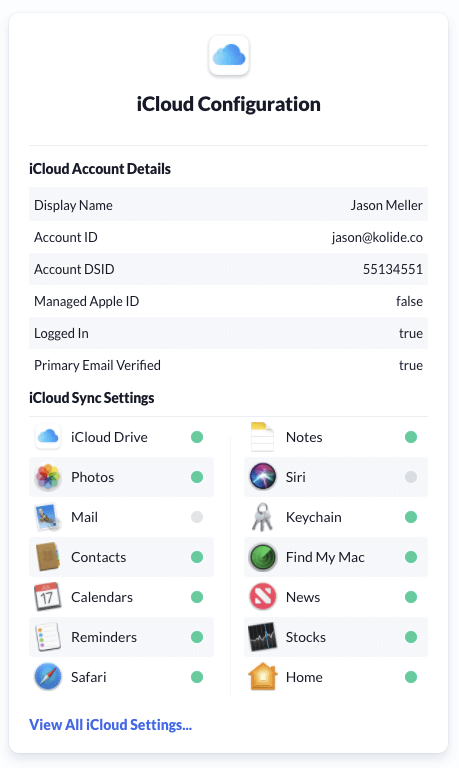 This widget shows you the iCloud information for the primary user of your device (if available). This information is not only helpful when determining whether an employee has a work-based or personal email associated with their device, you can also glance at what services are syncing content from their device to their iCloud account. This is especially useful if you do not want users accidentally syncing work-related files to their personal iCloud Drive.