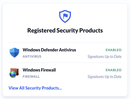 Microsoft Windows has a handy API which allows Kolide to see the products that take on the role of the primary Firewall provider or Antivirus software. While Kolide has been collecting this information in Inventory for a while, we felt that we should be visualizing this information on the Device’s detail view. Not only can you see the product names, but we can use this API to inform you if the signatures are properly updating.