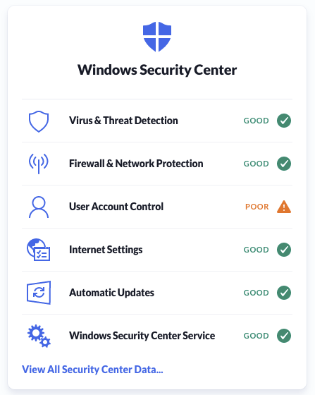 Unlike the other two widgets that visualize previously collected information, this widget contains new information from a recently added Osquery table we contributed to the project a few months ago. This table allows Kolide to enumerate the health of subsystems monitored by the Windows Security Center. We can now can summarize this information concisely in the widget below.