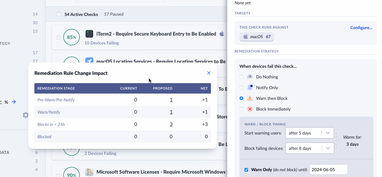 Finally, we’ve broken out the “Don’t Block Until…” settings so that they are always available to be set, in both the Block Immediately and the Warn and then Block strategies. Previously, this setting was only conditionally shown when we believed a remediation strategy change you made might result in blocking devices right away, now with this new impact preview, we can keep this setting available at all times.
