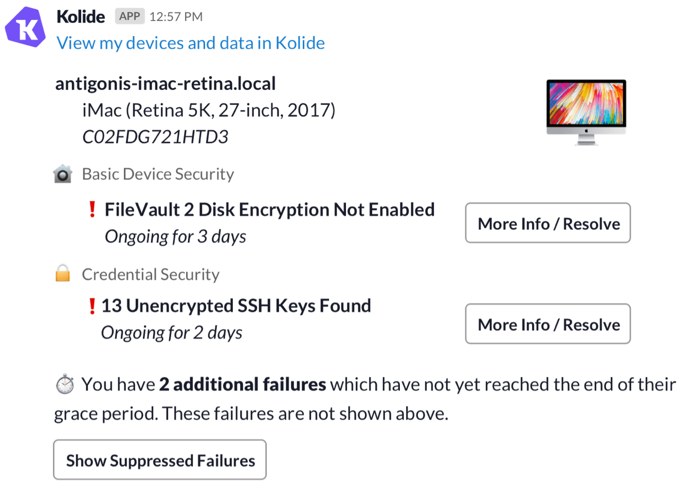 when interacting with the Kolide Slack app. If a user has failures that meet