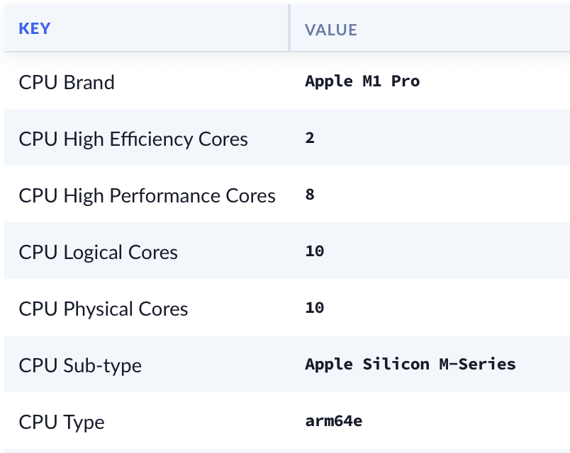 These new MacBook Pros feature two variants of the M1 CPU, the M1 Pro and the M1 Max. Previously, Kolide did not feature the true name of the CPU in our Device overview page; but now, we not only have the correct name for the chip, we also show you the logo!