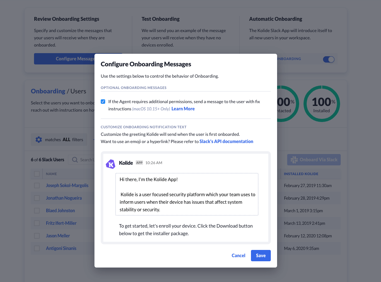 When you use Kolide’s Onboarding feature, Kolide may send additional messages to an end-user if they enroll a device that is missing the appropriate permissions on macOS. Sometimes though, you may not want your users to receive this message if you plan on granting the permissions en-masse later via an MDM like Jamf.