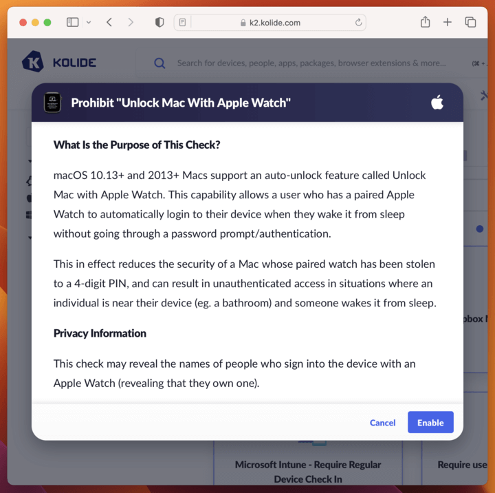 Let’s start with the tl;dr: We’re taking down our “Unlock Mac With Apple Watch” check because the feature is a little buggy on Apple’s side and we can’t always reliably detect if it’s enabled or not. Instead of fully getting rid of it, we wanted to document the query so customers can make it into a custom check if they want.
