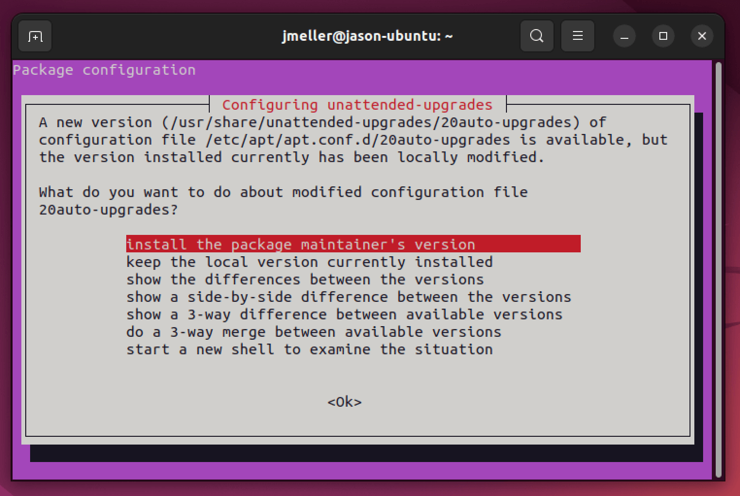/etc/apt/apt.conf.d/20auto-upgradeswith the correct settings. There may be an existing/conflicting installation screen that looks like the screenshot below. If you see that screen, simply replace the file with the new version to get the default behavior.