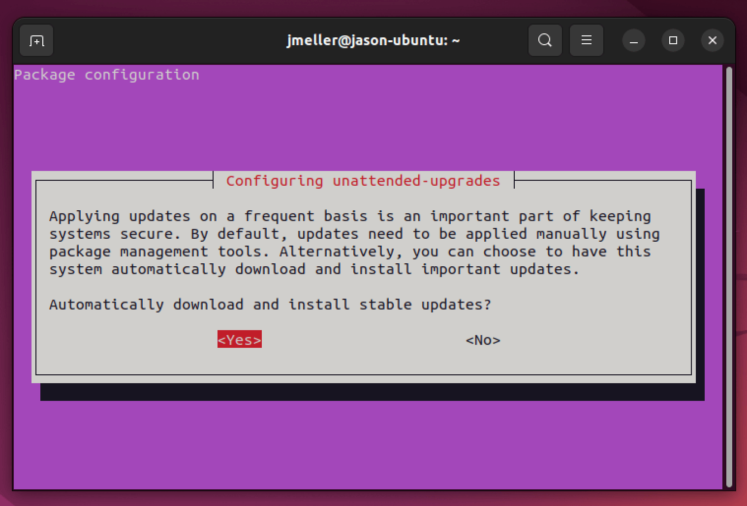 sudo dpkg-reconfigure -plow unattended-upgradeswhich will then display the following interactive prompt: