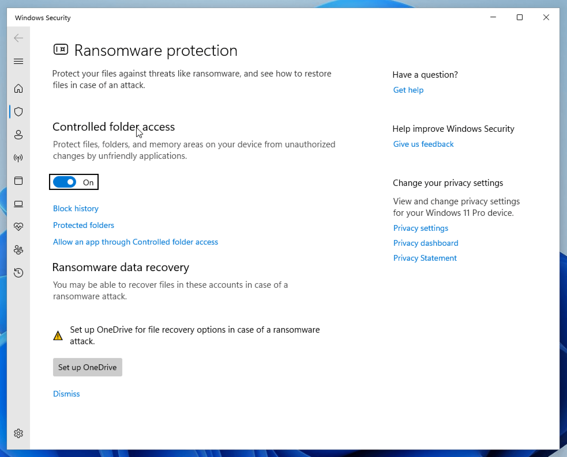 Controlled Folder Access is available on Windows 10 (version 1709 or later) and all versions of Windows 11, but it is not enabled by default.