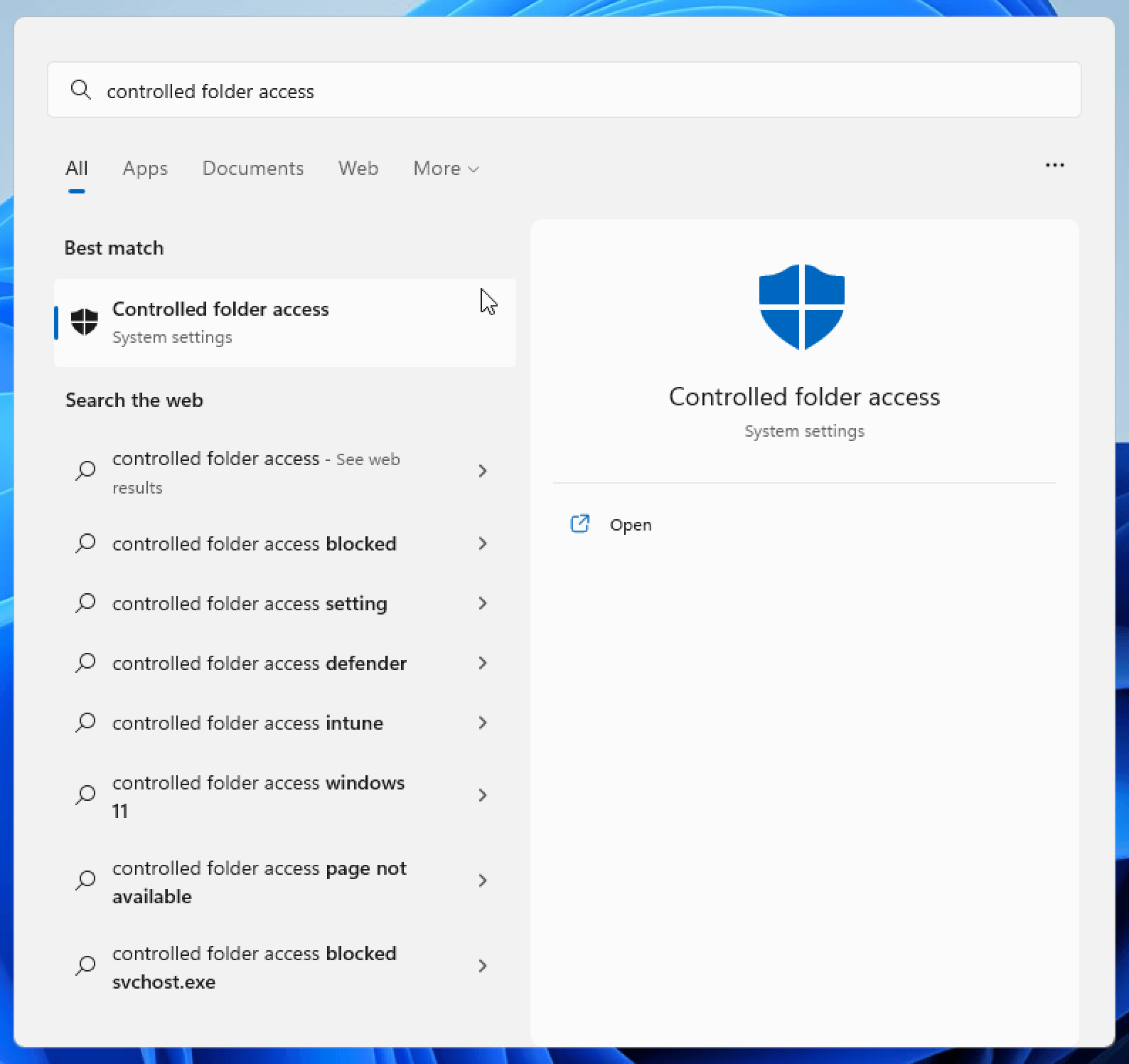 Open the Windows Start Menu Search Bar and type Controlled Folder Access